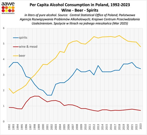 Analiza danych z lat 2008–2023 pokazuje, że spożycie wina i miodów pitnych wahało się w przedziale od 5,8 do 8,2 litra rocznie. W szerszym horyzoncie czasowym – porównując np. do lat 90. – widać jednak wyraźny trend spadkowy. Obrazuje to m.in. wykres udostępniony przez American Association of Wine Economists (AAWE) na ich profilu na Facebooku: